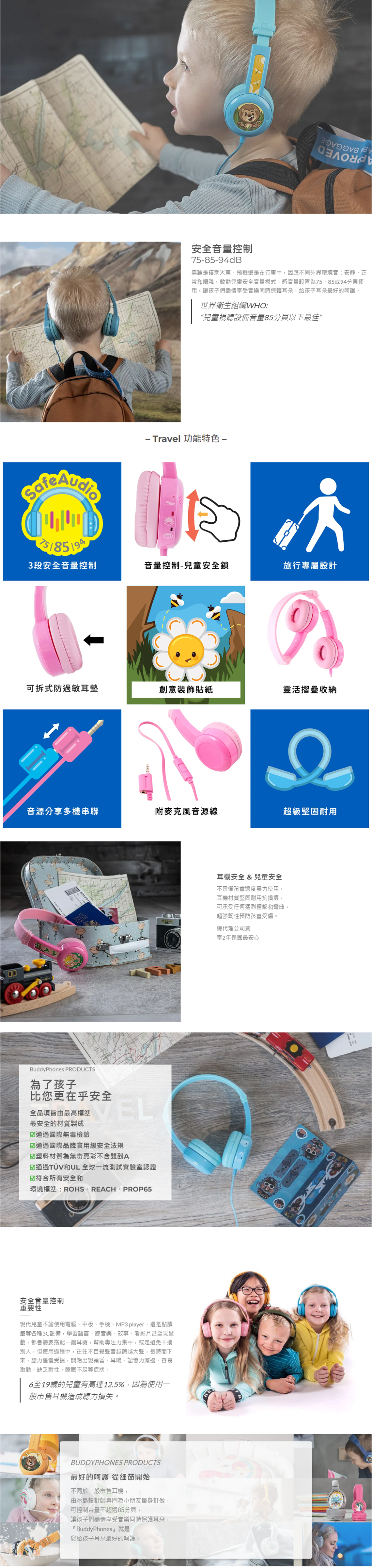 有線旅行系列具有專利安全音量控制技術,具有專利安全音量控制技術,提供75-85-94分貝三種安全音量選擇模式,可依照不同外界環境音,為孩子選擇適合聆聽音量使用。