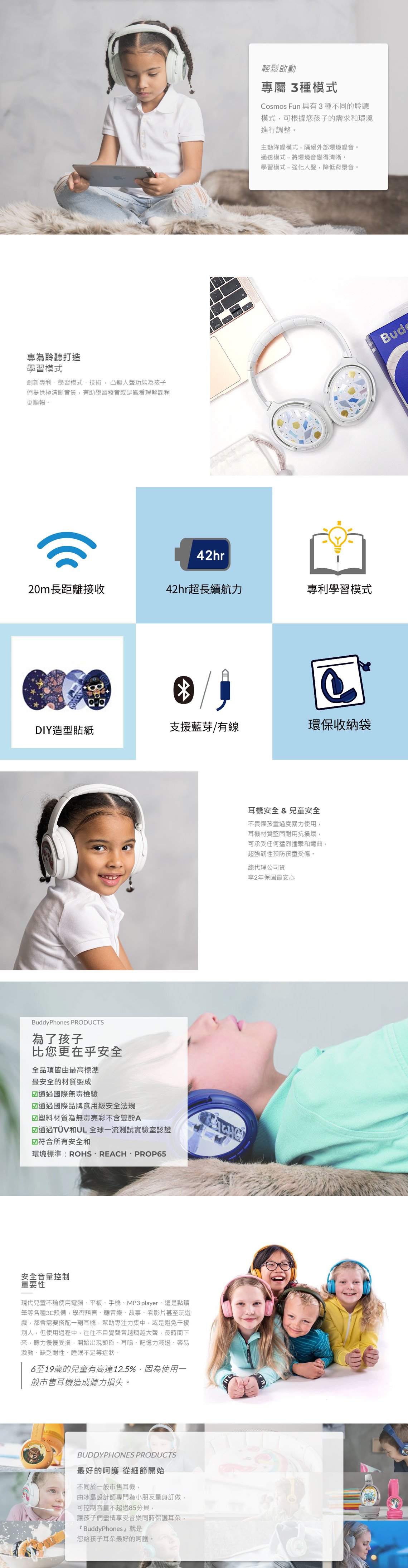 BuddyPhones Cosmos Fun藍芽降噪旅遊系列,消除環境中令人分心的噪音,讓孩子在學習時更加專注!